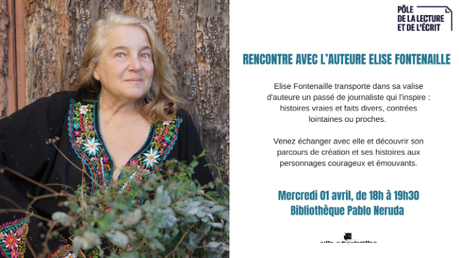 Découvrez les écrits d'Élise Fontenaille au cours de cette soirée animée par les bibliothécaires. Ce temps d'échange sera agrémenté par des lectures de textes et d'écoutes de podcasts, créés par des écoliers et collégiens d'Échirolles. |